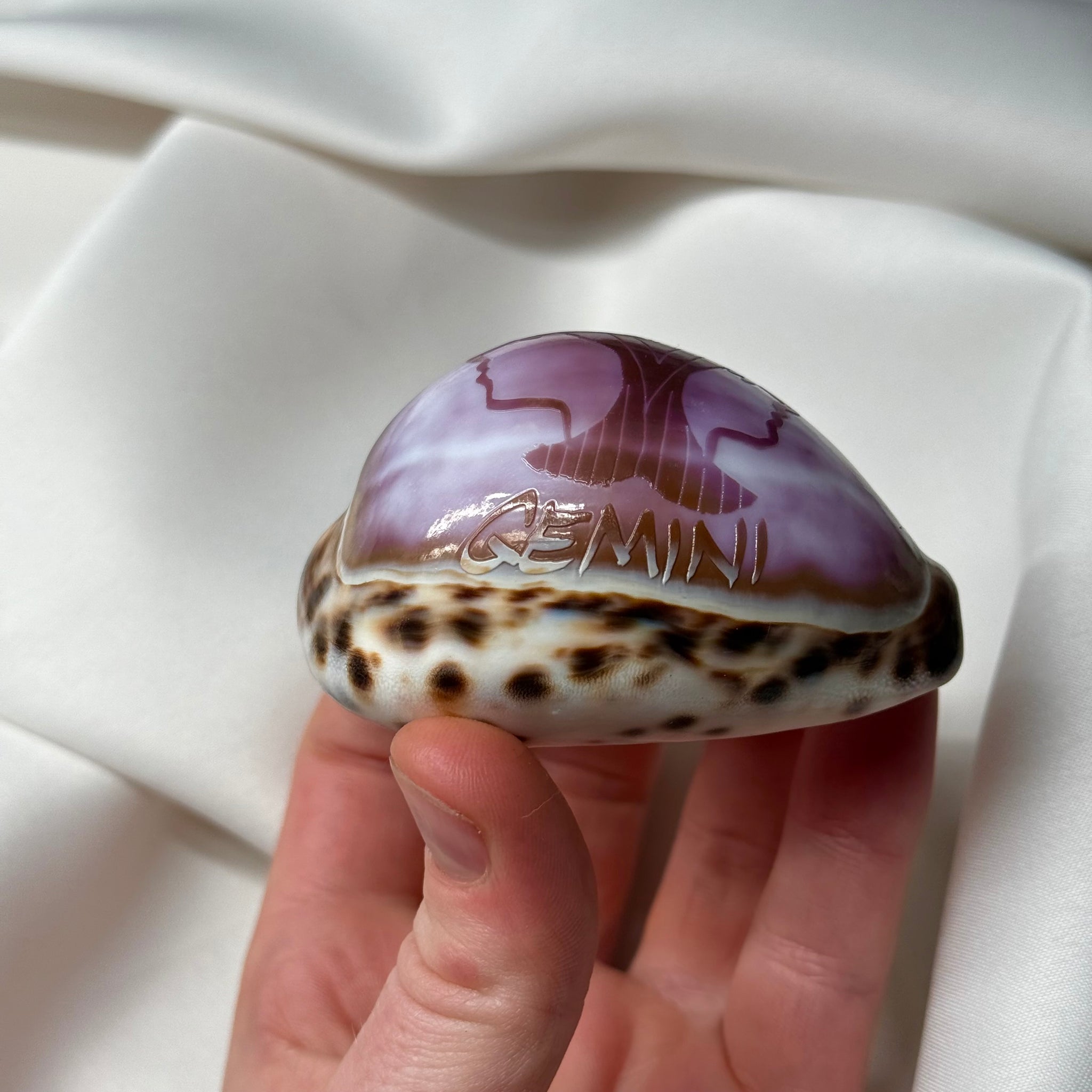 • Load image into Gallery viewer, Purple Cowrie with Painted Gemini Zodiac Design