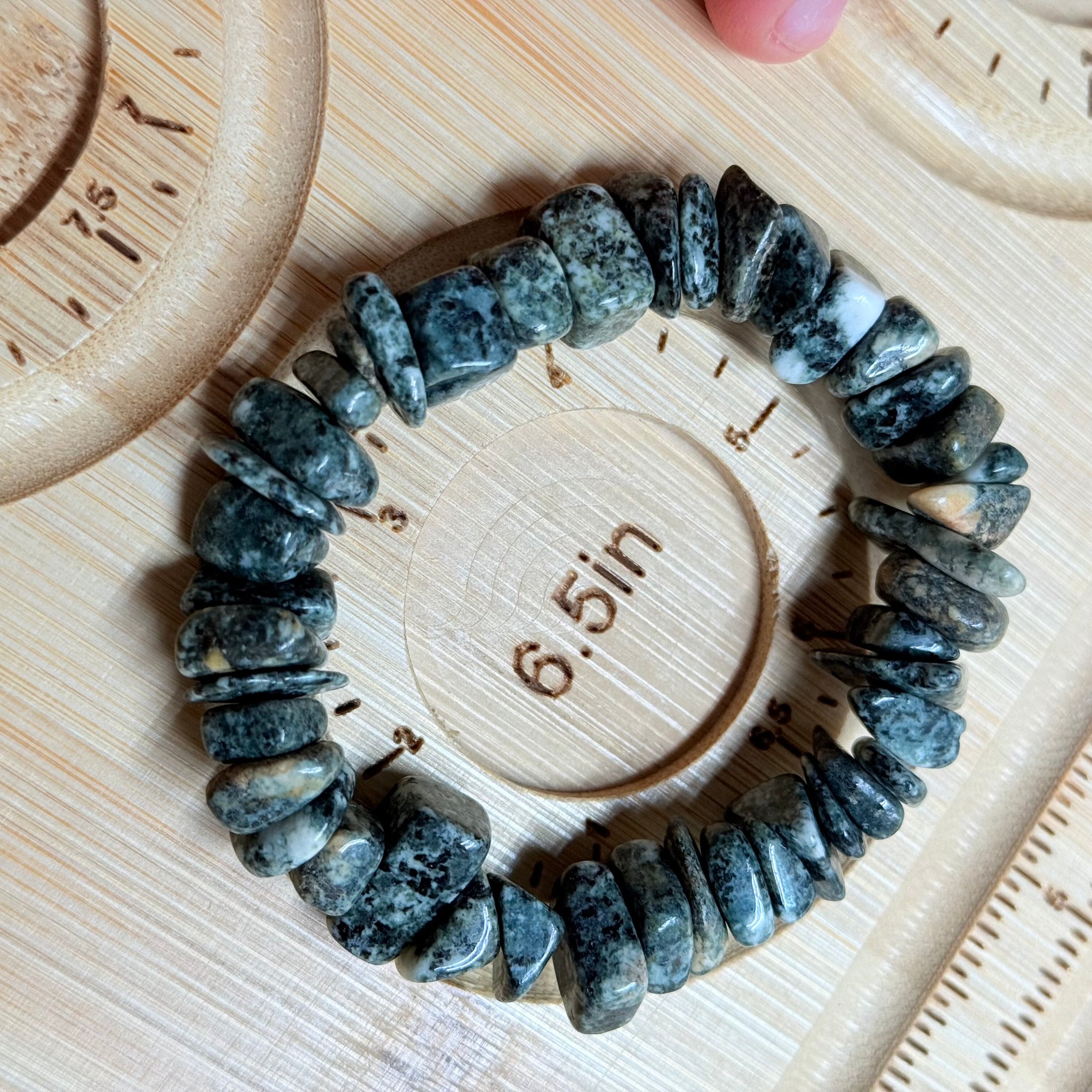 Listing is for one intuitively selected bracelet. This material comes from a quarry in Wales, which is the same location & material some of the rocks at Stonehenge come from! Please note any surface “imperfections” such as cracks/chips/scratches/caves that are common in natural crystals and may be present.