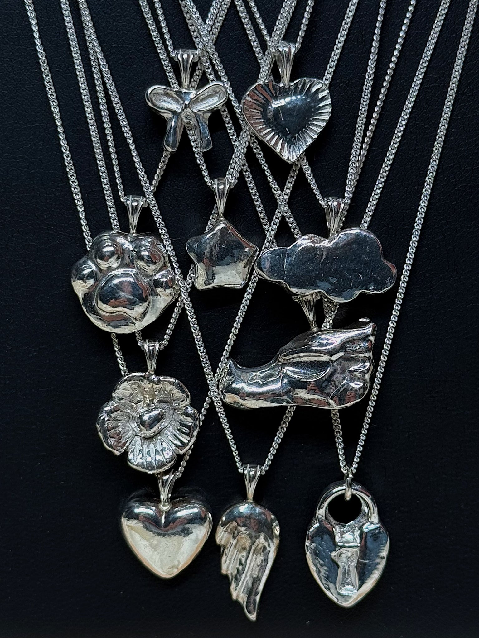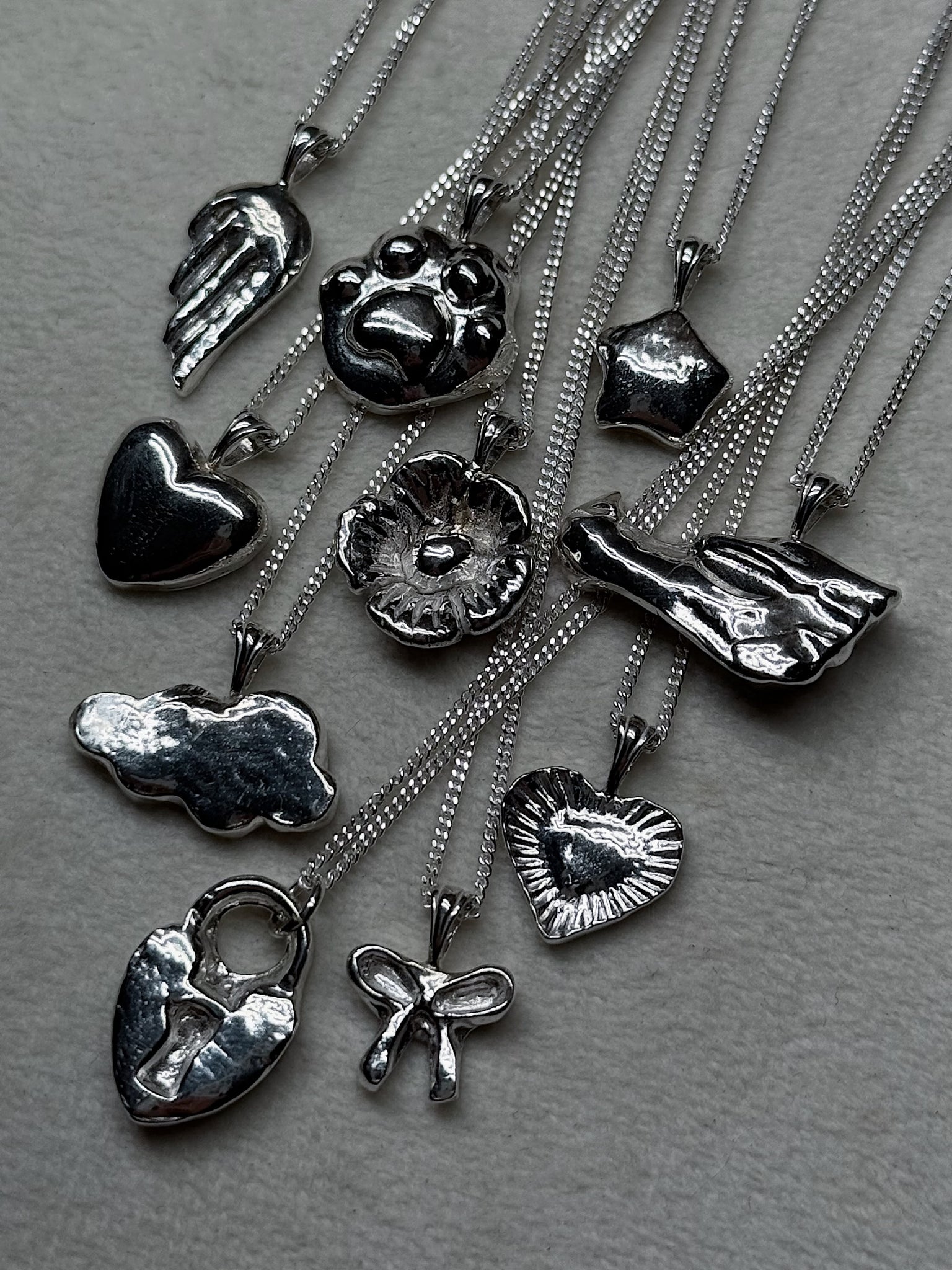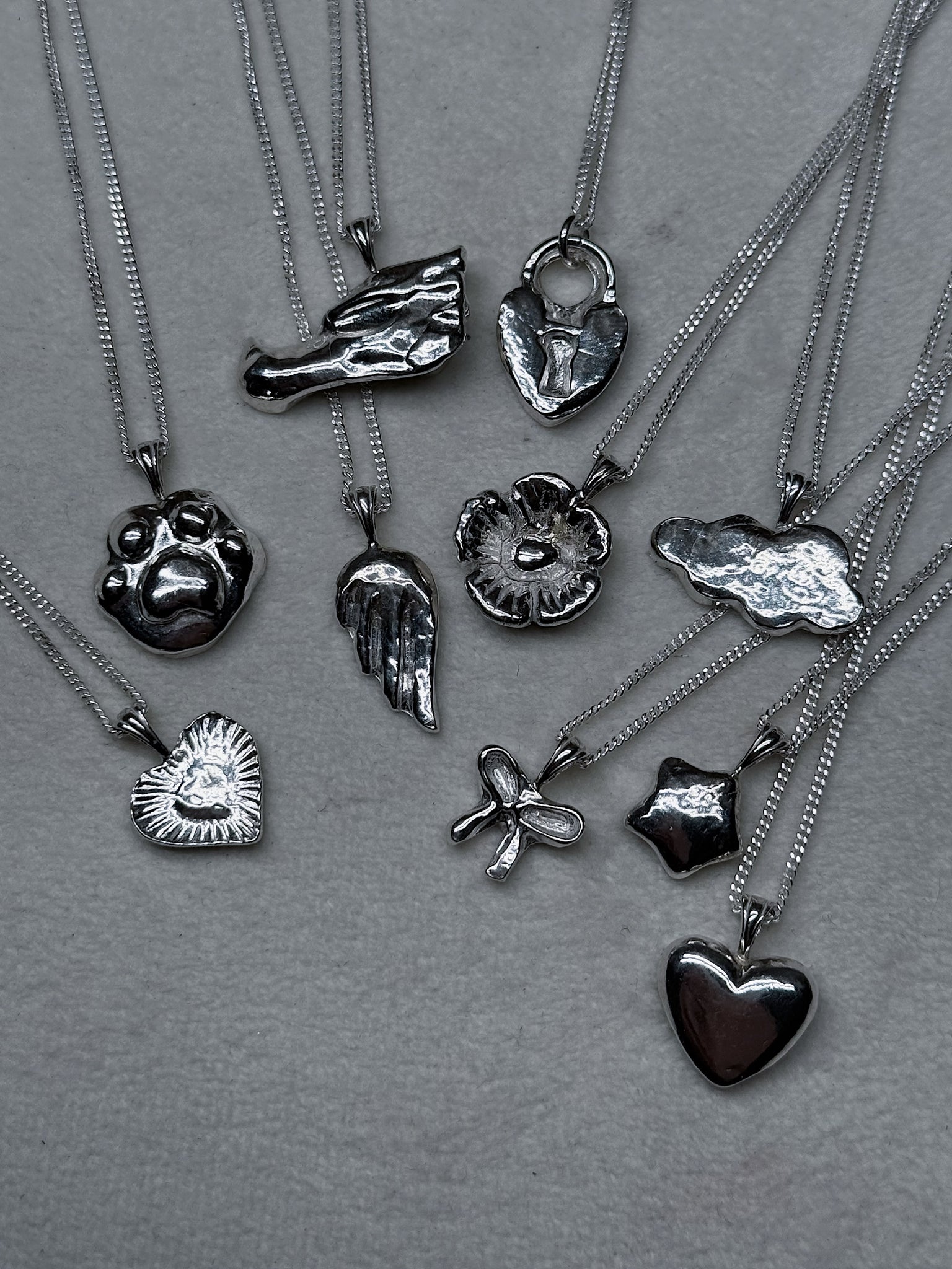 Listing is for pictured necklace, handmade out of .925 Sterling Silver Clay (a medium combining silver and clay particles that, once exposed to fire, burns away the clay particles leaving a solid piece of Sterling silver). Due to its handmade nature, there will be slight scratches, bumps, and dips in the piece. Comes on a Sterling Silver Chain.